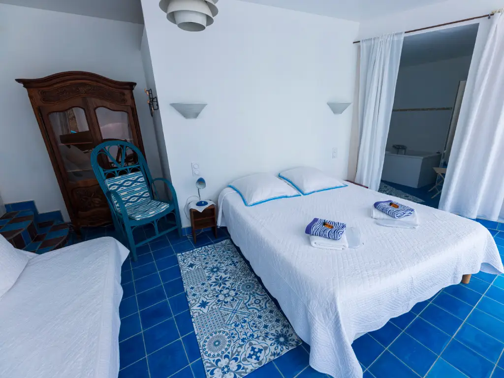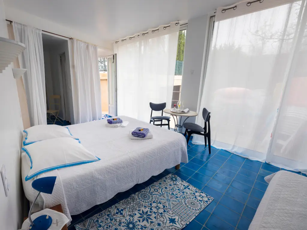 D'une surface de 40m², "La Chambre Bleue" est composé d'une chambre, d'un balcon et d'un accès proche de la piscine.