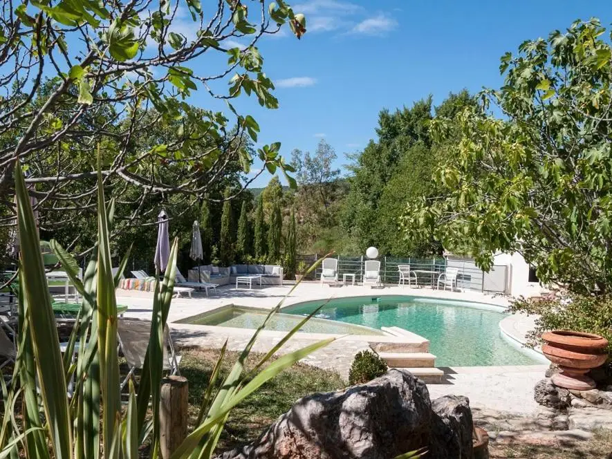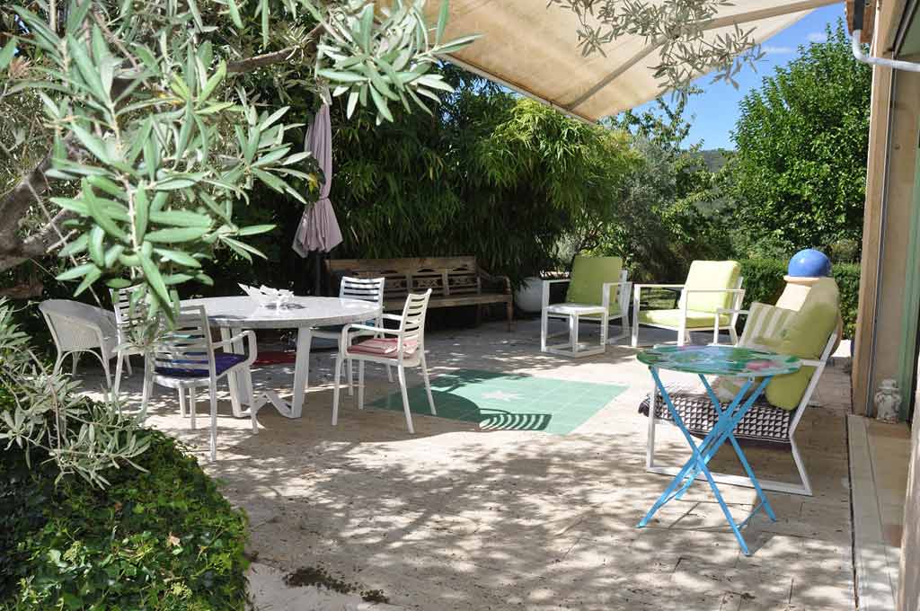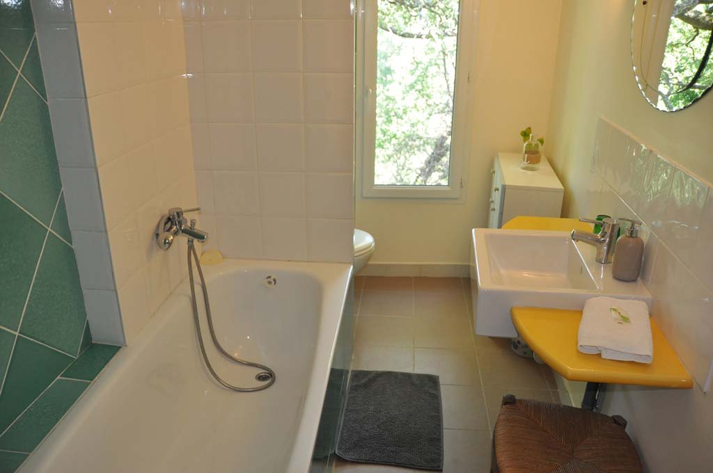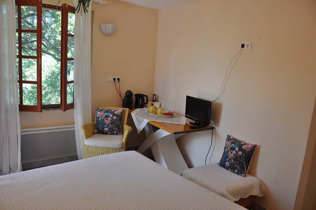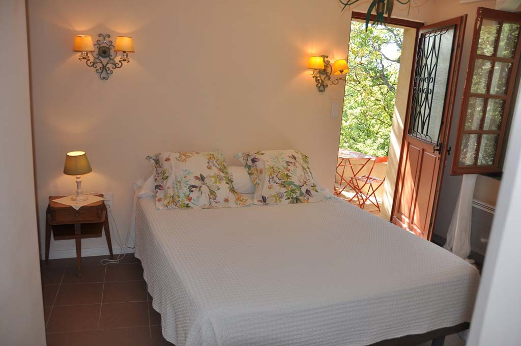 La chambre de 19m2 située à quelques pas de la piscine jouit d'une terrasse privative avec vue sur les chênes centenaires.